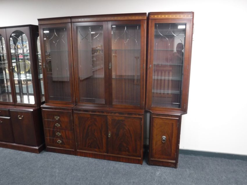 An inlaid mahogany triple section corner bookcase