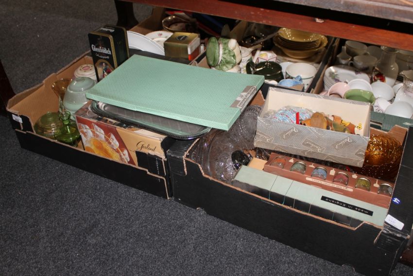 Two boxes of glass, metal ware, Art Deco light shades, punch bowl set etc