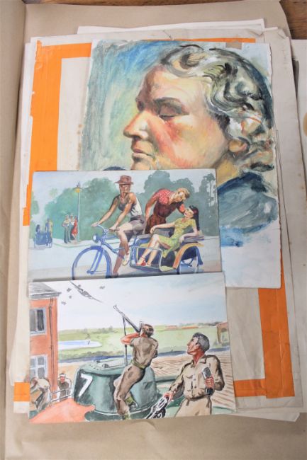 John Armstrong : Gunners shooting incoming aircraft, watercolour, 18 cm x 26 cm, together with nine further illustrator's watercolours by the same artist, unframed. (10) CONDITION REPORT: John Armstrong is a renowned artist and famous illustrator of children’s comics. He attended art school in Middlebrough's Constantine College, where he graduated in Intermediate Arts and Crafts. He started as a commercial artist for a Newcastle ad agency while also doing book illustrations. He eventually also took on drawing comic strips and has mainly worked for the UK girls' titles during the 1970s, 1980s and 1990s. After a ballet story published in Girl's Crystal, he drew 'Cherry and the Children' for five years in School Friend. Armstrong is best known for his gymnastics strip 'Bella', that ran in Tammy. By 1978 he was drawing 'Moonchild', a girls' story with horror elements, for Fleetway's Misty. In the 1980s he drew a comic based on the children's school drama 'Grange Hill' for Beeb and then began an association with the girls' titles of DC Thomson, drawing 'The Secret Gymnast' and horse stories for Bunty, among other things. He also produced much original artwork for the educational booklets published by Pitmans.
