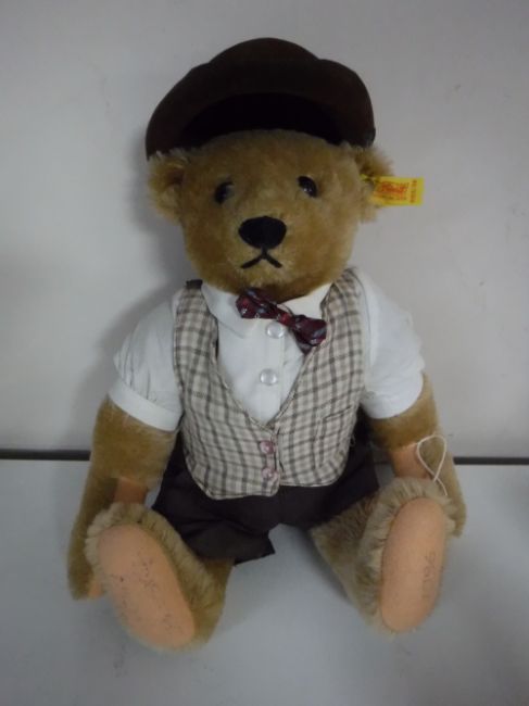 A Steiff brown mohair bear wearing glasses and a hat, signed to the foot, length 35 cm.