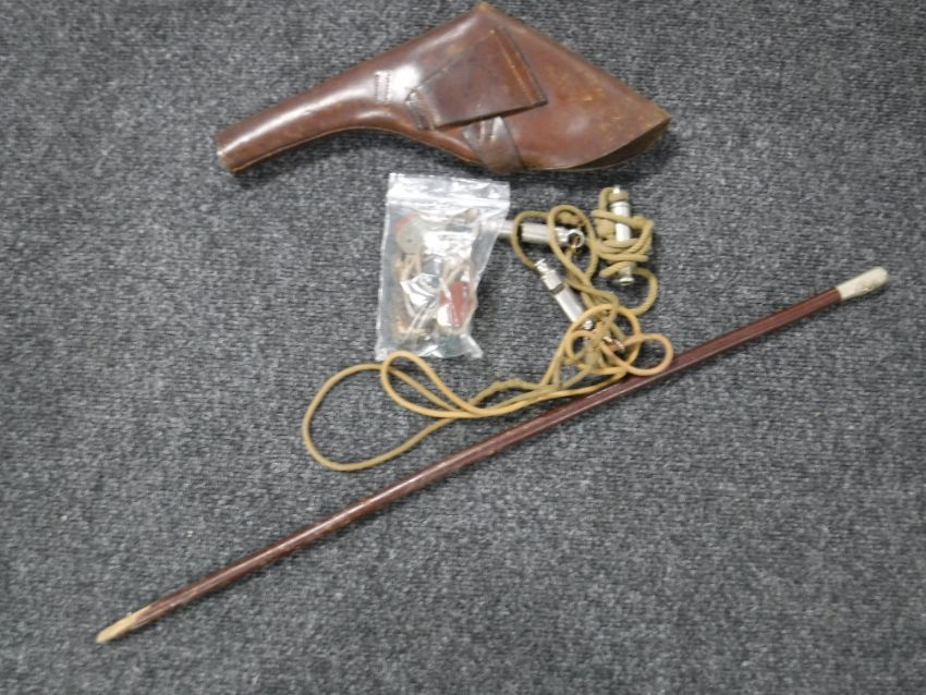 A military swagger stick together with ID tags, St. Johns ambulance bags, three whistles on lanyards and leather holster