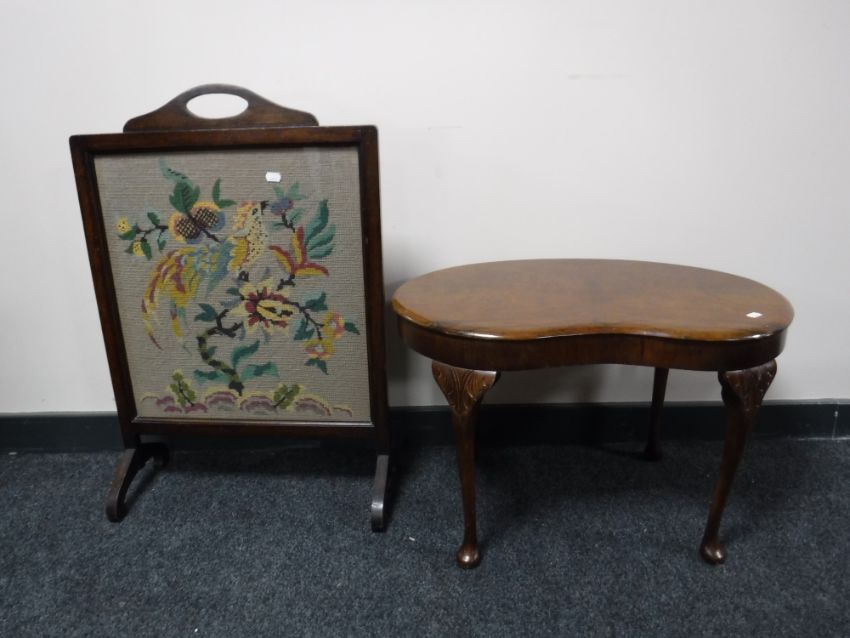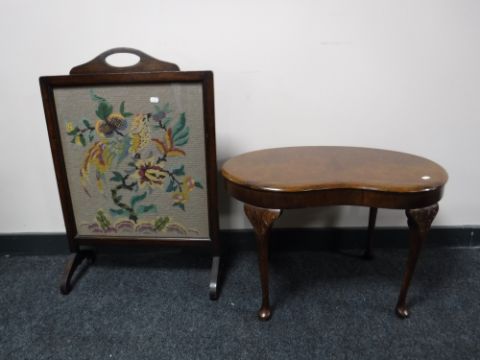 A walnut kidney shaped coffee table and an oak fire screen