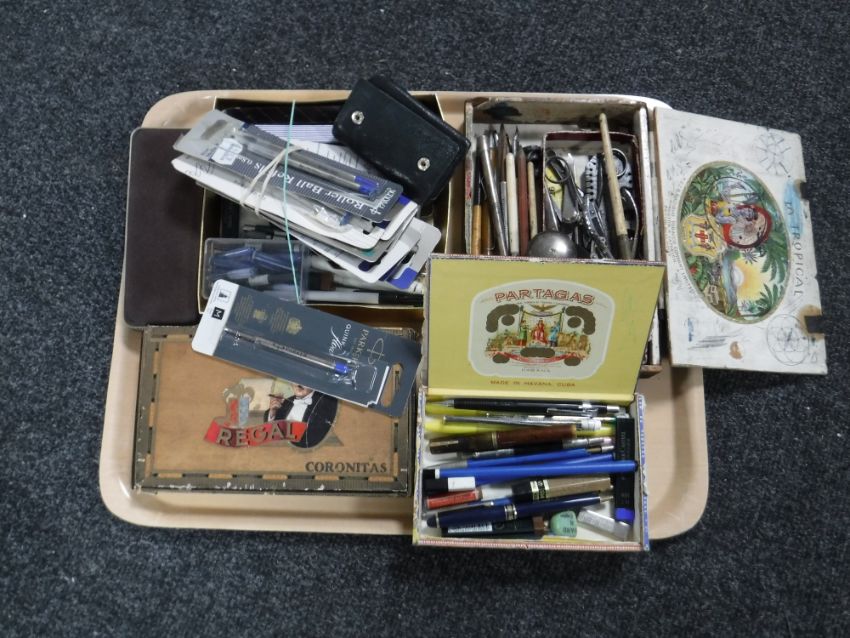 A tray of pens and writing related items, some with 14ct gold nibs.