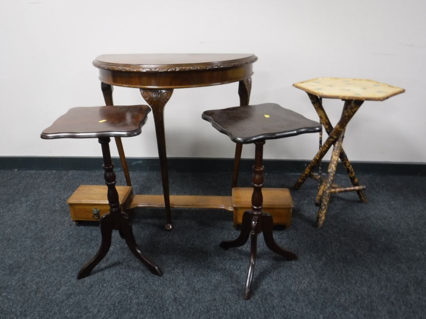 A pair of mahogany pedestal wine tables, hall table, bamboo occasional table and oak shelf fitted two drawers