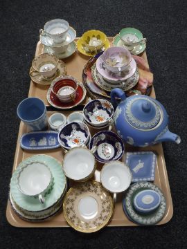 Two trays of decorative tea cups, saucers, wall plates, Wedgwood Jasper ware etc