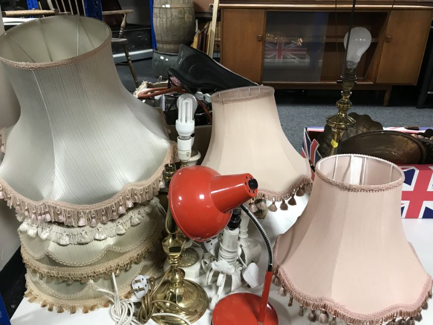 A box of Bohemian crystal, glass comports, trinket tray, glass vases together with eight assorted table lamps with shades etc