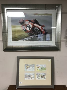 After Rod Organ : The Blackburn Bullet, signed limited edition colour print, together with four framed post cards depicting the Hartlepool Monkey legend. (2)