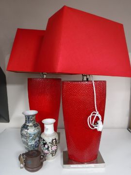 Two large contemporary red table lamps with shades together with two Oriental style vases and Chinese pottery teapot