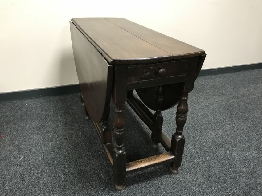 An antique oak gate leg table fitted a drawer