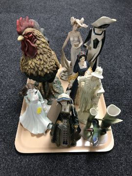 A tray of Leonardo cockerel, two Regency art figures -Jane Seymour and Catherine Howard, Franz king fisher spill vase, Coalport ladies of fashion figure - Sarah etc