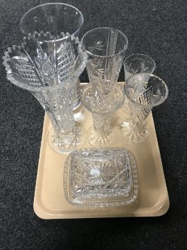 A tray of six glass vases including a pair of Edinburgh crystal vases, glass butter dish with cover