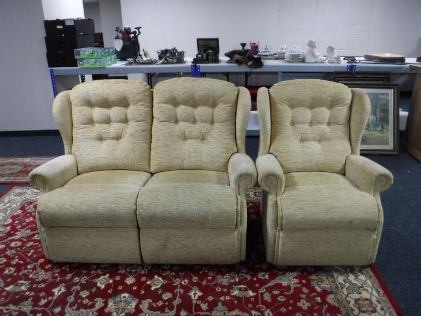 Two seater settee and armchair in a gold button fabric
