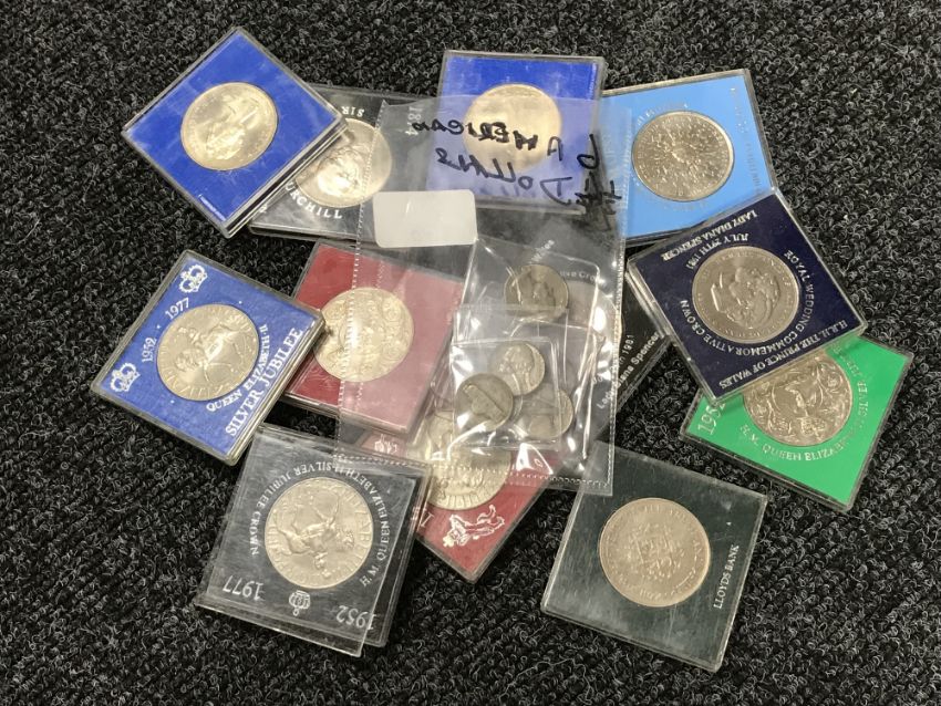 A collection of twelve Crowns (modern) and six quarter dollars.