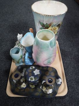 A tray of early twentieth century Bretley four piece china trinket set, Beswick vase, West German vase, Coalport village pastille burner, pottery wash basin and jug , Royal Doulton gemstone collection figure - Amethyst