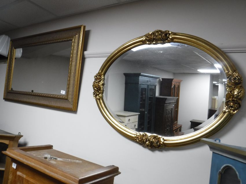 A contemporary gilt framed overmantel together with gilt framed bevelled edge mirror