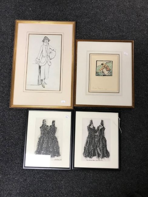 Two framed Lizzie Rowe pictures, a gilt framed picture of a lady, a Lucian Pizzaro print - Little Man