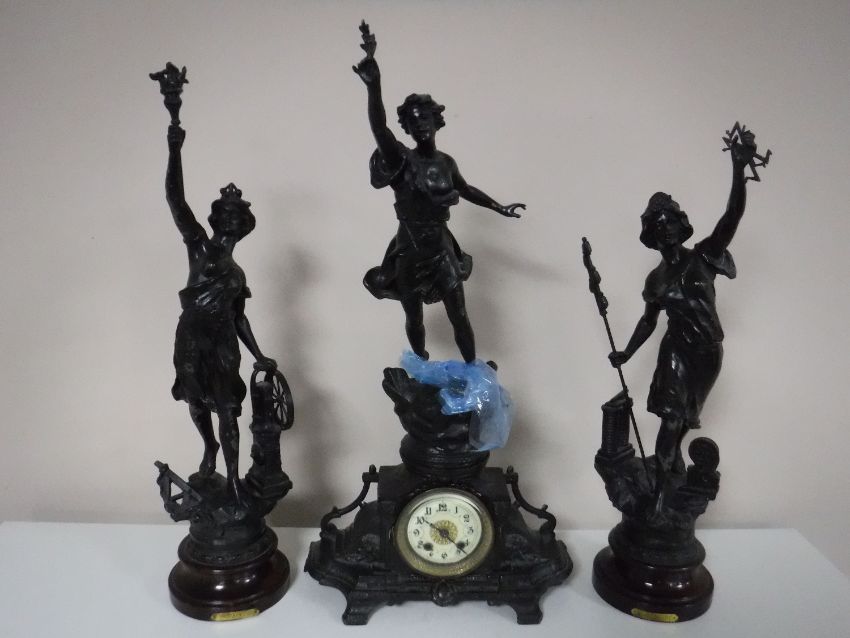 A three piece French spelter clock garniture
