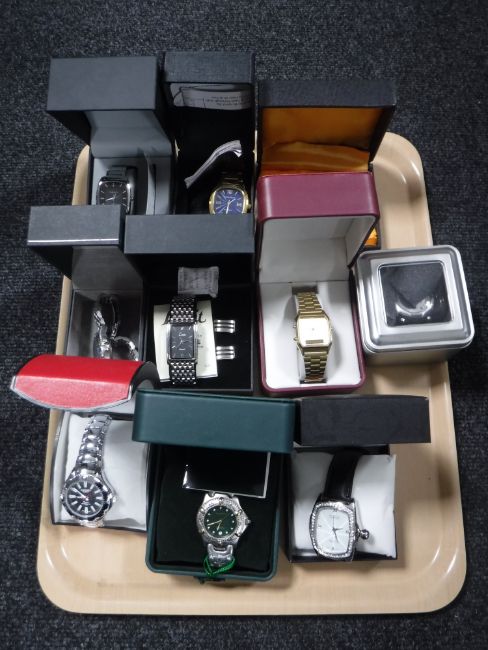 A tray of ten assorted gent's wristwatches; Citizen, Diamond and Co, Crug-Baumen