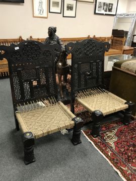 A pair of Arabic hardwood seats, width 70 cm . (2)