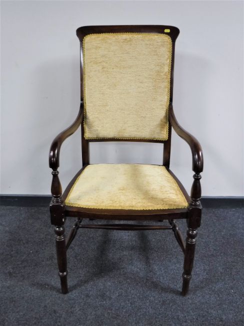 A mahogany armchair upholstered in a gold fabric