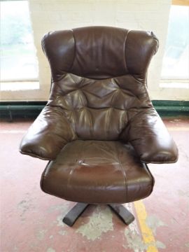 A brown leather swivel armchair