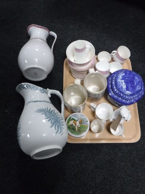 A tray containing an antique china tea service, Ringtons caddy, Goss beaker, two wash jugs etc