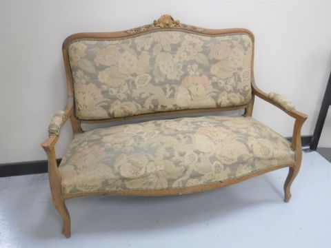 Early 20th century. Upholstery generally quite tired. Frame with signs of old worm. Some small losses to pediment of back rest. Width 130cm.