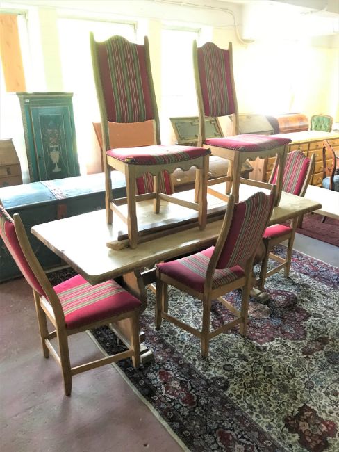 An early 20th century oak refectory table and six blonde oak dining chairs