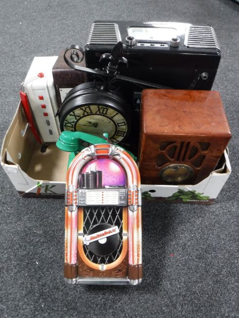 A box of retro style telephone Steepletone turn table, station clock, tins etc