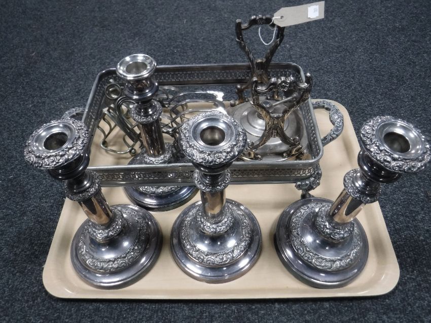 A tray of twentieth century plated wares, set of four telescopic candlesticks (one lacking sconce), spirit kettle stand, toast racks etc