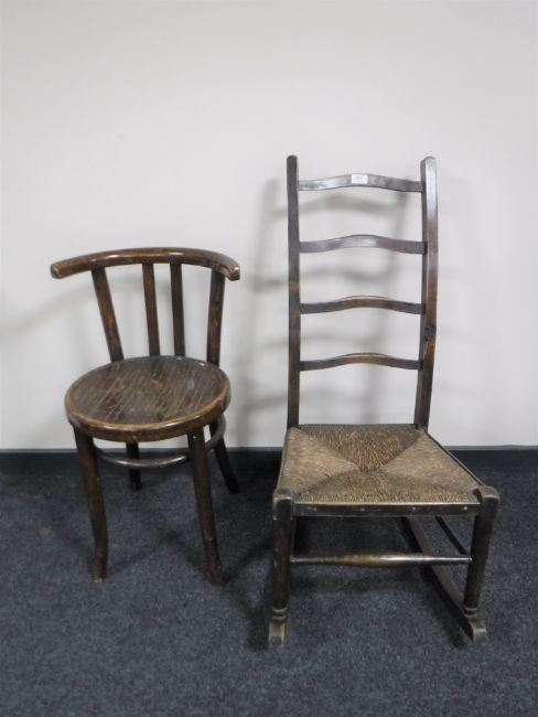 An Edwardian oak ladder backed rocking chair together with a bentwood chair