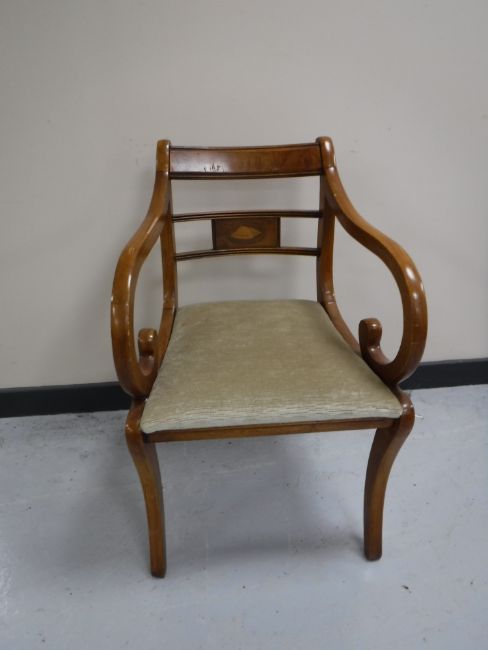 An inlaid mahogany scroll-arm armchair