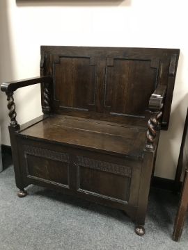 An Edwardian oak hall seat, width 91.5 cm