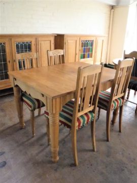 A blonde oak dining table and four rail back chairs