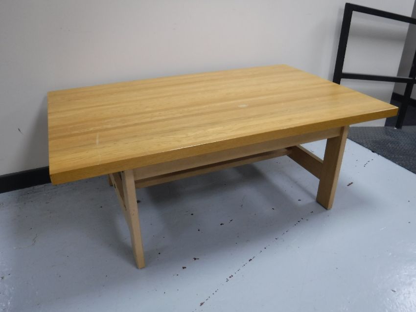 A contemporary beech coffee table