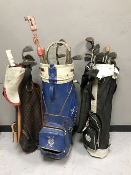 Three golf bags of assorted irons, putters and a driver