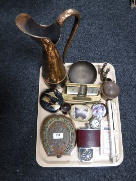 A tray containing an oak horseshoe card box, hip flask, pocket compass, hand fans, brass desk clock etc
