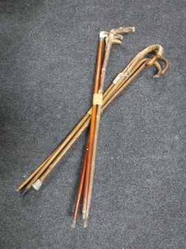 Two bundles of walking sticks including one horn handled example with silver mount and one with brass bird's head handle