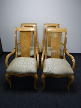 Four contemporary high backed dining chairs in a walnut finish
