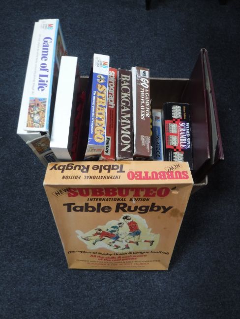 A box of vintage board games, Subbuteo, table rugby, blow football and a Quick Drawer Company draughtsman's set