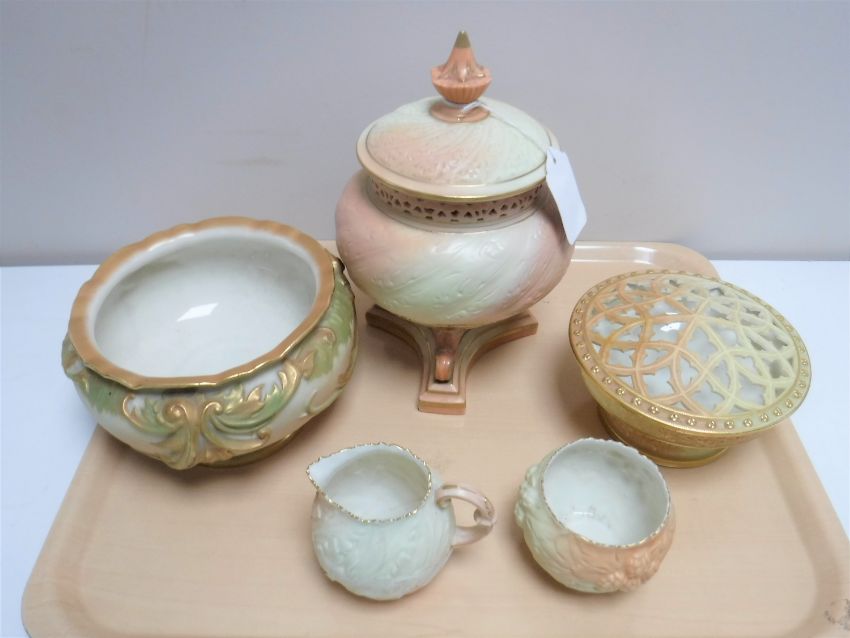 A Royal Worcester gilded pot pourri bowl with lid, height 9 cm, together with a Royal Worcester gilded blush ivory bowl and three pieces of Locke & Co Worcester - lidded vase, sugar and milk jug. (5)