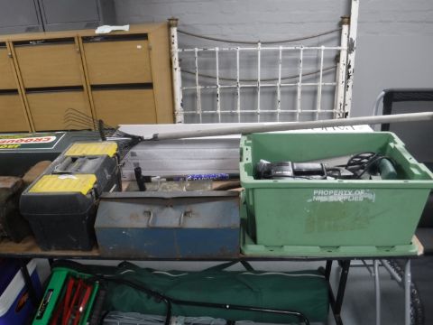 Two tool boxes of hand tools, box of electric sanders, tile cutter and three garden tools