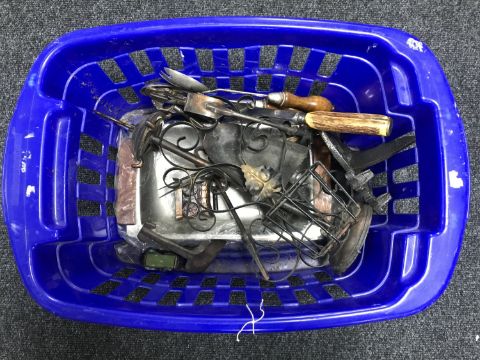 A basket containing assorted metal ware, including companion set, trivet, cutlery, carving set, etc