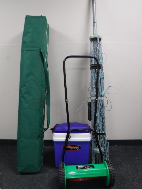 A pop up gazebo in carry bag, rotating clothes airer, power base push mower and a cool box
