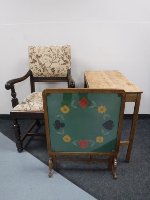 An early 20th century scroll arm armchair, an occasional table and a folding screen table
