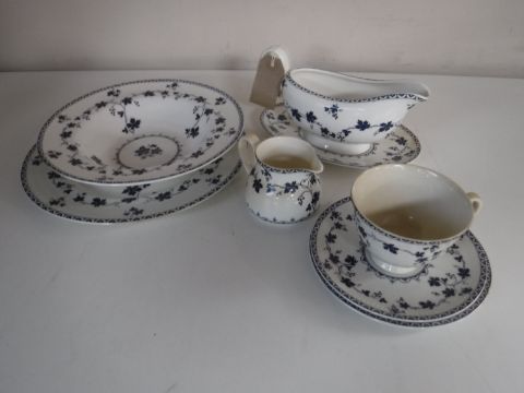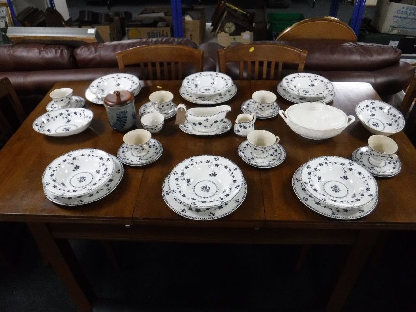 Thirty-six pieces of Royal Doulton Yorktown tea and dinner ware together with a Wedgwood Country ware lidded tureen and a blue and white salt glazed lidded pot
