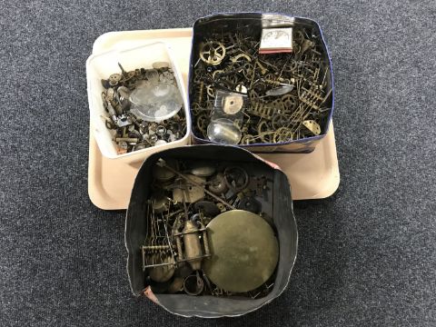 Two trays of wrist watch and clock parts, pendulums etc