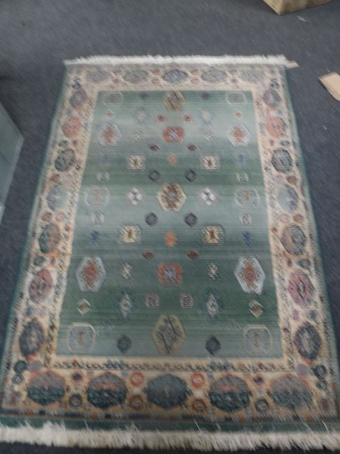 A contemporary fringed woollen rug on green ground