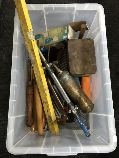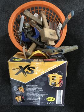 An Auto XS car jump starter, two boxes of hand tools, mitre saw, vintage brass fire extinguisher, etc