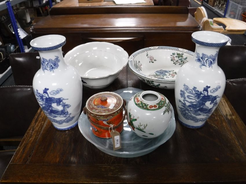 Two Japanese blue and white vases depicting Geisha together with a hand painted Japanese lidded barrel, ginger jar, glass bowl and two pottery wash basins